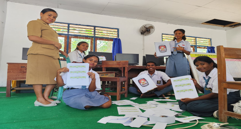 Keterangan foto: Tampak Komisi Pemilihan OSIS, Perangkat OSIS dan Pembina OSIS sementara menyiapkan surat suara pemilihan OSIS dan kotak suara. Selasa, 21 Oktober 2025.
